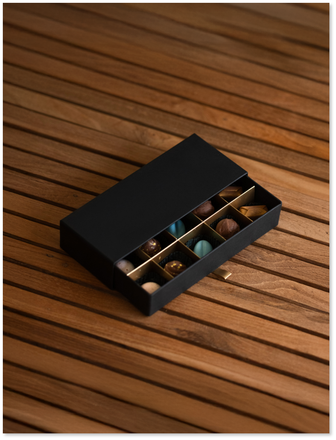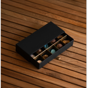 A luxurious hardboard gift drawer, with a selection of 10 sprayed pralines and/or truffles of your choice from our list of available flavours and forms. Plus, we also design, print and place your companies branding onto a premium sleeve, tailoring each chocolate gift drawer to your companies event or gifting occasion.